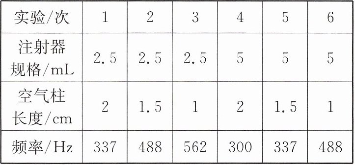 小明找来了两个未使用过的一次性注射器制成了两个哨子,如图所示,注射器的规格分别为 2.5 mL 和 5 mL。他边吹哨子边调整注射器内空气柱的长度,同时利用专用仪器测出声音的频率,见下表。