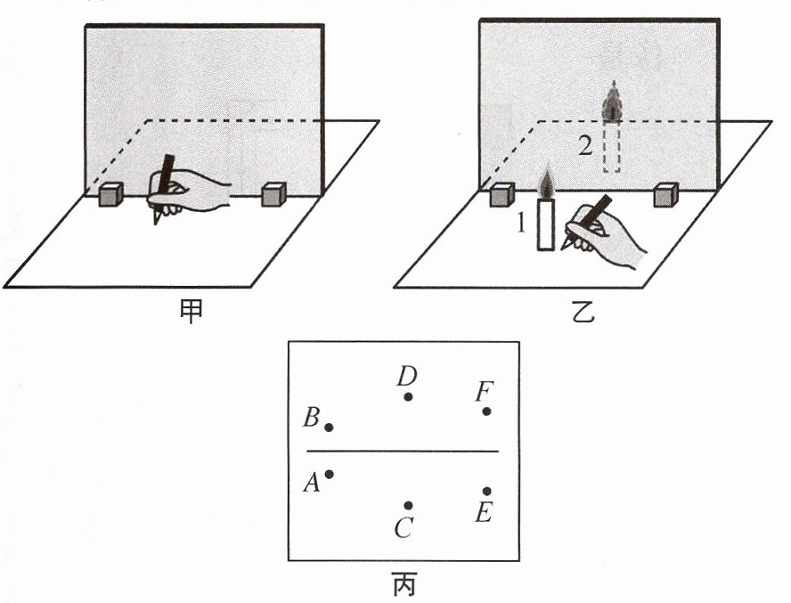 玻璃板方向移动,才能与蜡烛1的像再次重合。(3)三次实验物和像的位置记录如图丙所示。他在探究像和物的连线与平面镜位置的关系时,用直线连接图丙中物点A与像点