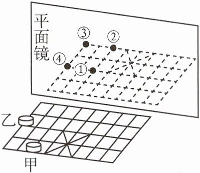 3. 如图所示,在中国象棋棋盘正中央竖立一块垂直于棋盘的平面镜,棋子“象”由甲位置移到乙位置,则平面镜中“象”的移动路径是 (
