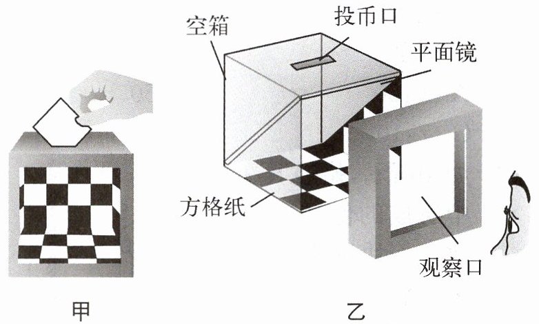 4. 魔术是深受同学们喜爱的节目,其中包含着许多科学原理。图甲是某同学自制的一只魔术箱,表演时他将开口的方形空箱正面展示给观众,把纸币从空箱顶端的投币口投入,结果纸币“不翼而飞”。原来魔术箱中有一块平面镜(图乙),它与箱底的夹角为