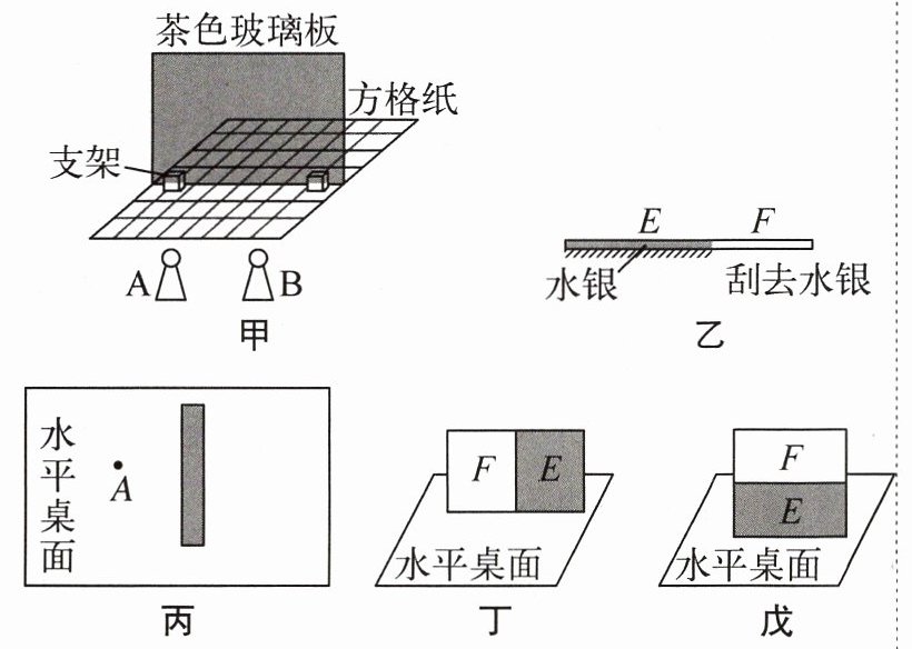 (5)刮去部分水银的目的是使平面镜透光,便于确定像的位置,为了便于坐在镜面两侧的同学观察操作过程中的实验现象,且更有利于实验探究,透明的部分应放在上面,应按照图戊所示的方式放置。