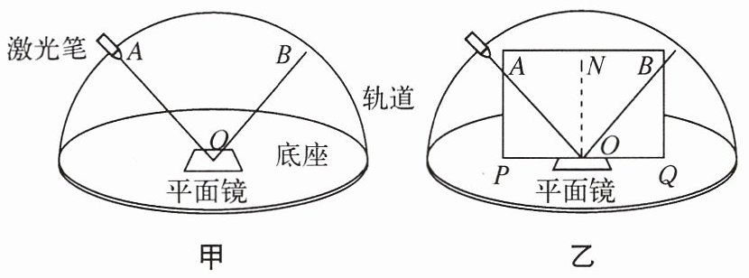 (2)多次改变激光笔在轨道上的位置,小红调整视角,均能观察到反射光OB挡住入射光AO的现象,如图乙所示,将长方形纸板与AO、OB所在平面重合,其底边PQ紧贴平面镜,在纸板上即可显示出入射光线和反射光线,多次测出纸板和平面镜的夹角: