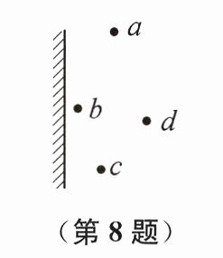 8. 平面镜前有4个发光点,如图所示。图中眼睛不能看到其虚像的发光点是 ( )