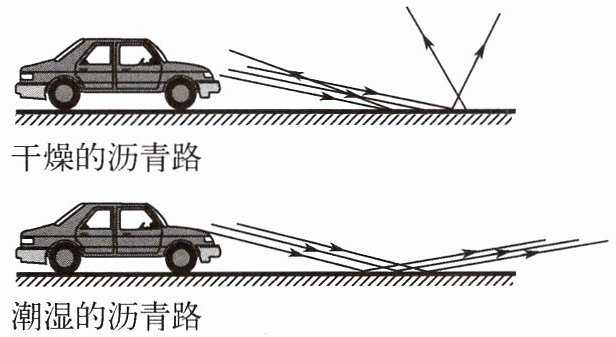 C 提示:由图可知,光照射到潮湿的路面,更容易发生镜面反射,故A错误。由图可知,光照射到干燥的路面,更容易发生漫反射,不是折射,故B错误。由于光照射到潮湿的路面,更容易发生镜面反射,反射光线平行射出,几乎没有反射光线进入驾驶员的眼睛,所以对面无车时,驾驶员看潮湿的路面更暗,故C正确。照射到干燥路面的光发生漫反射,漫反射也遵循光的反射定律,故D错误。