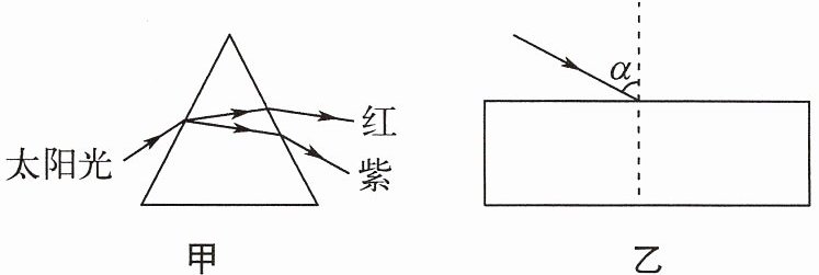 6. 图甲是太阳光通过三棱镜时发生的折射现象示意图。在图乙中,一束红光和一束紫光先后以相同的入射角α从空气射向上下表面平行的玻璃砖的同一点,并都能从下表面射出。下列说法正确的是(