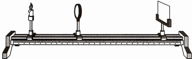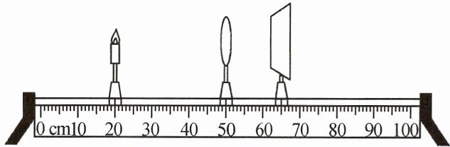 移动光屏,观察像是否变模糊。蜡烛在如图所示位置,光屏上成清晰的像,则像的大小比烛焰大