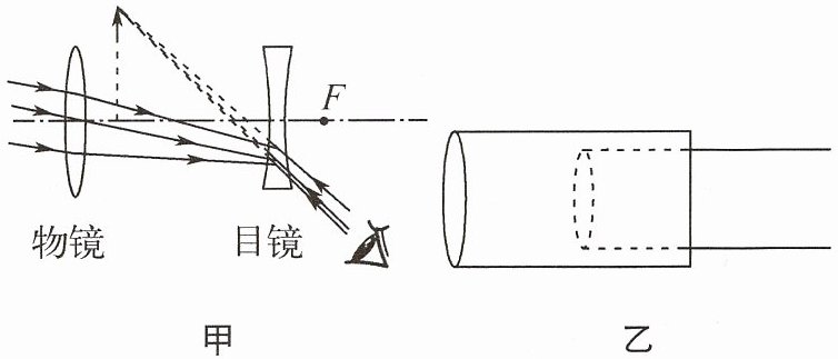 望远镜有不同的类型。其中有一种望远镜是由一凸透镜和一凹透镜组成的。靠近眼睛的目镜用的是凹透镜。靠近被观测物体的物镜用的是凸透镜。这种望远镜是由物理学家伽利略发明的,其原理如图甲。