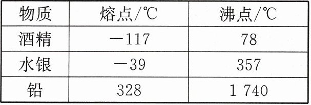 C 提示:$80^{\circ }C$的酒精应该是气态,因为由表中数据可知:酒精的沸点是$78^{\circ }C$,故A错误。气温接近$-50^{\circ }C$时,不能用水银作温度计的测温液体,因为这时,水银已经凝固,故B错误。水银在熔化过程中吸热,但温度不变,此时温度就是$-39^{\circ }C$,故C正确。铅的凝固点是$328^{\circ }C$,故D错误。