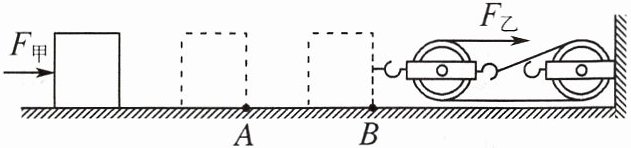 7. 如图所示,甲工人用水平推力$F_{甲}$推动重为750 N 的货物,在水平路面上匀速移动 2 m 至仓库门口 A 处,用时 10 s,此过程中甲工人做功的功率$P_{甲}= 30W$;乙工人接着使用滑轮组拉动该货物在同样的路面上匀速移动 3 m 到达指定位置 B,拉力$F_{乙}$为80 N。求: