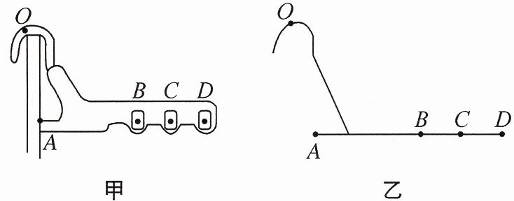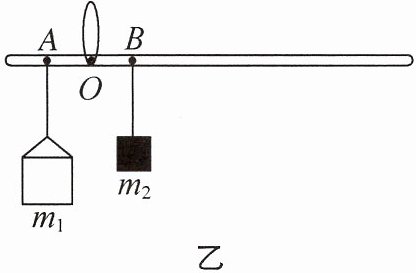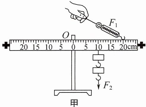 (2)图甲中$F_{2}$的力臂$l_{2}$为10.0cm,$F_{1}$竖直向上拉杠杆,水平平衡时,$F_{1}$的力臂$l_{1}$为20.0cm,$F_{1}=\frac{F_{2}l_{2}}{l_{1}}=\frac{1N×10.0cm}{20.0cm}=0.5N$。