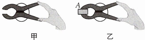 < 向上 费力 提示:用手捏开夹子时,手施加的力是动力,夹子上的卡簧对夹子的作用力是阻力,此时$l_{1}>l_{2}$,故为省力杠杆,$F_{1}<F_{2}$。用夹子夹住木块时,夹子对木块施加一个向下的力,木块会给夹子一个向上的力,此时$l_{1}<l_{2}$,为费力杠杆。