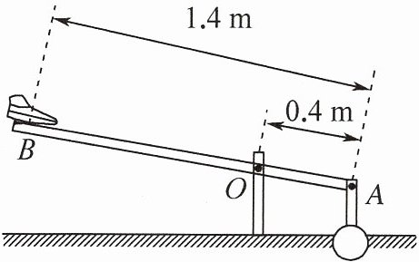 1 省力 20 > 提示:不计摩擦和杆重,O为支点,脚沿与杆垂直的方向用力$F_{1}$时,动力臂为OB,$OB=1.4m - 0.4m = 1m$,此时杆为省力杠杆;当脚竖直向下用力时,$l_{1}:l_{2}=OB:OA$,$F_{2}=\frac {G×l_{2}}{l_{1}}=\frac {G×OA}{OB}=\frac {50N×0.4m}{1m}=20N$,脚竖直向下的动力臂小于脚沿与杆垂直方向的动力臂,故$F_{2}>F_{1}$。