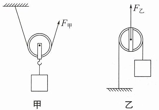 D 提示:图甲中拉力没有沿竖直方向,故拉力$F_{甲}$要大于物体和动滑轮总重的$\frac{1}{2}$,即$2F_{甲}>G_{物}+G_{动}=50N+10N=60N$,得$F_{甲}>30N$。图乙中拉力作用在动滑轮的轴上,以动滑轮为研究对象,同一根绳子的拉力相等,即$F_{1}=F_{2}=G_{物}$,$F_{乙}=F_{1}+F_{2}+G_{动}=2G_{物}+G_{动}=2×50N+10N=110N$。