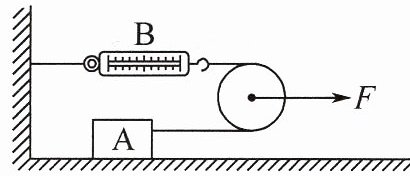 11. 如图所示,在水平拉力 F 的作用下重 100 N 的物体 A 沿水平桌面做匀速直线运动,弹簧测力计 B 的示数为 10 N,物体 A 移动的速度为 0.2 m/s,则拉力 F 的大小为______N,拉力 F 移动的速度为______m/s,物体 A 与水平桌面的摩擦力大小为______N。