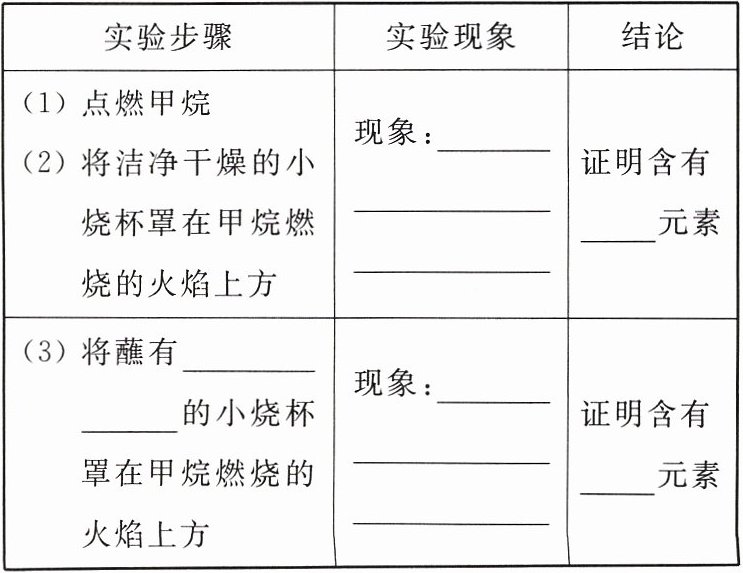 | (1)点燃甲烷(2)将洁净干燥的小烧杯罩在甲烷燃烧的火焰上方 | 现象:______ | 证明含有______元素 |