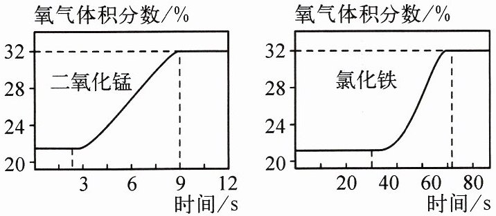 (2)②据图可知,当氧气体积分数都达到32%时,即收集到相同体积的氧气时,用二氧化锰的时间为9s,用氯化铁的时间大于60s,所以使过氧化氢分解较快的催化剂是二氧化锰。③装置不能控制反应的速率,根据分析可知二氧化锰使过氧化氢分解速率更快,故选择氯化铁可以使过氧化氢分解反应速率适中,得到平稳的氧气流。