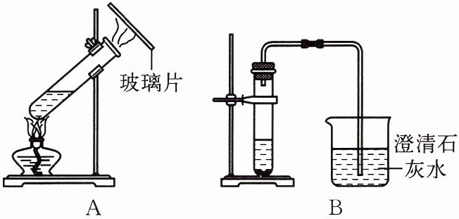 (1)水沸腾,有气泡冒出,玻璃片上有水珠凝结 (2)大理石表面有气泡冒出,且大理石逐渐减少,烧杯中的澄清石灰水变浑浊 (3)装置 A 中发生物理变化,装置 B 中发生化学变化