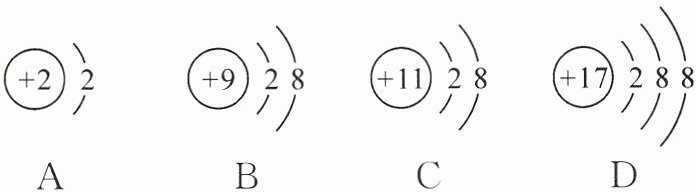 C 提示:A粒子核内质子数为2,电子数为2,质子数=核外电子数,为原子;B粒子核内质子数为9,电子数为10,质子数<核外电子数,为阴离子;C粒子核内质子数为11,电子数为10,质子数>核外电子数,为阳离子;D粒子核内质子数为17,电子数为18,质子数<核外电子数,为阴离子。