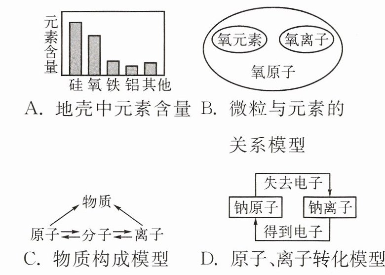 D 提示:地壳中元素含量由多到少前四种元素:氧、硅、铝、铁;氧离子和氧原子都属于氧元素;宏观上物质是由元素组成的,微观上物质是由分子、原子和离子构成的;钠原子失去电子变成钠离子,钠离子得到电子变回钠原子。