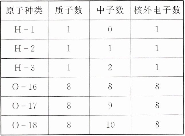 (3)①1个C - 14原子中含有6个质子,相对原子质量为14,则含有14 - 6 = 8个中子。②表中的三种H原子有6种组合H - 1和H - 1、H - 2和H - 2、H - 3和H - 3、H - 1和H - 2、H - 1和H - 3、H - 2和H - 3,和O - 16原子最多可构成6种水分子。