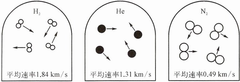 $(H_2$:平均速率1.84 km/s;He:平均速率1.31 km/s;$N_2$:平均速率0.49 km/s,每个气体分子运动示意图)