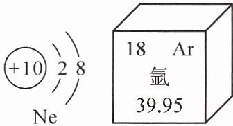 (左:氖原子结构示意图:+10 2 8,标注Ne;右:氩元素周期表信息:18 Ar 氩 39.95)