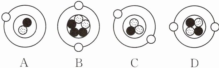 (A、B、C、D四个粒子结构示意图,每个图中有○、●、◎)