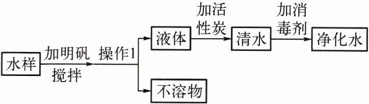 (图中流程:水样→加明矾搅拌→操作1→液体→加活性炭→清水→加消毒剂→净化水,同时操作1分离出不溶物)