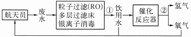 (图中流程:航天员→废水→粒子过滤(RO)多层过滤床→银离子消毒→①饮用水→航天员;饮用水→②催化反应器→氢气+氧气)