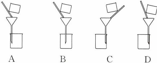 D 提示:A中漏斗末端的尖嘴口没有紧贴烧杯内壁;B中漏斗颈没有靠烧杯内壁,可能导致液滴溅出;C中玻璃棒没有斜靠在三层滤纸处。