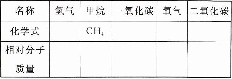 名称氢气甲烷一氧化碳氧气二氧化碳化学式H₂ CH₄ CO O₂ CO₂相对分子质量2 16 28 32 44