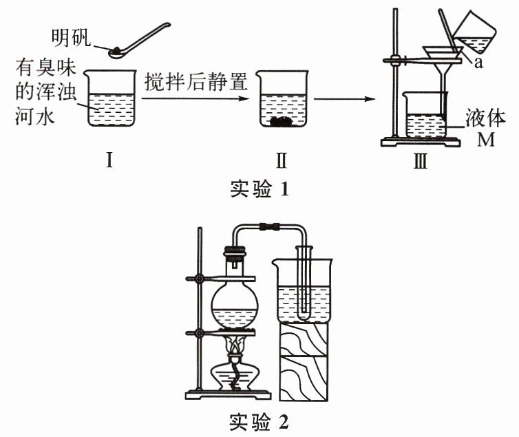 (1) ②活性炭具有吸附性,作用是去除有颜色有异味的杂质,为提高净化效果,下进上出,进水口是b,该装置不能去除可溶性杂质,不能将海水淡化。(2)②操作Ⅲ中玻璃棒的作用是引流,若液体M仍然浑浊,原因可能是滤纸破损或漏斗中液面高于滤纸边缘等。③用实验1中净化后的水通过实验2制取蒸馏水,装置中烧瓶下方需要垫上陶土网,分散热量。