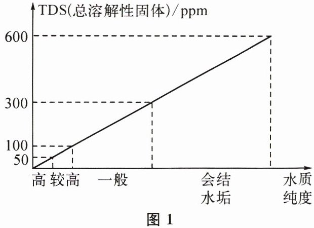 ①水质检测:TDS(总溶解性固体)/ppm 与水质纯度的关系如图 1 所示,当地湖泊水的 TDS 值如图 2 所示,其水质纯度为______(填“高”“较高”“一般”或“会结水垢”)。