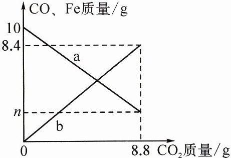 D 提示:一氧化碳和铁的氧化物反应生成铁和二氧化碳,随着反应的进行,二氧化碳的质量逐渐增大,一氧化碳的质量逐渐减少,铁的质量逐渐增大,则a表示${CO}$的质量变化,b表示${Fe}$的质量变化;当生成8.8g二氧化碳时,根据碳元素质量守恒,参加反应的一氧化碳的质量为$\frac{8.8\ g×\frac{12}{44}×100\%}{\frac{12}{28}×100\%}=5.6\ g$,$n = 10 - 5.6 = 4.4$;当生成8.8g二氧化碳时,生成铁的质量为8.4g,参加反应的一氧化碳的质量为5.6g,根据质量守恒定律,参加反应的铁的氧化物的质量为$8.8\ g+8.4\ g-5.6\ g=11.6\ g$,根据铁元素质量守恒,则参加反应的铁的氧化物中铁元素的质量为8.4g,氧元素的质量为$11.6\ g-8.4\ g=3.2\ g$,${Fe_{x}O_{y}}$中$x:y = (\frac{8.4\ g}{56}):(\frac{3.2\ g}{16})=3:4$;参加反应的铁的氧化物的质量为11.6g,则加入的铁的氧化物的质量$m\geqslant11.6$。