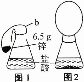 11. 某同学在科技活动课上用如图所示的实验装置论证质量守恒定律,瓶内放了足量的盐酸,b 是未充气的气球,里边放有 6.5 g 锌粉,将它紧紧套在瓶口上(图1)。将图1的装置在托盘天平上称量,质量为 $W_1\ g$,然后将气球内锌粉全部倒入瓶内,立即产生气体,气球逐渐胀大,锌粉(与盐酸反应生成氢气)全部反应(图2)。反应结束后,再次称量,质量为 $W_2\ g$,结果 $W_2<W_1$。试分析: