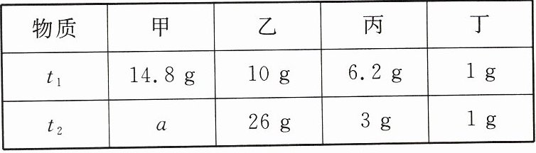 D 提示:根据反应前后物质总质量不变,可知$14.8\ g+10\ g+6.2\ g+1\ g=a+26\ g+3\ g+1\ g$,$a = 2\ g$;丁反应前后质量不变,可能是催化剂五氧化二钒;甲、丙质量减小,是反应物,乙质量增大,是生成物三氧化硫;参加反应的甲、乙、丙质量比是$(14.8\ g-2\ g):(26\ g-10\ g):(6.2\ g-3\ g)=4:5:1$,由反应${SO_{2}}+{O_{2}}\longrightarrow{SO_{3}}$和质量守恒定律可知,1分子${SO_{2}}$反应生成1分子${SO_{3}}$,则${SO_{2}}$与${SO_{3}}$的质量比为$64:80 = 4:5$,故甲是${SO_{2}}$,丙是${O_{2}}$。