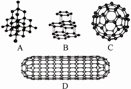 11. 小刚很喜欢看有关科学发明的书,据书介绍:近几年,科学家们发现,除金刚石、石墨外,还有一类新的以单质形式存在的碳。如$C_{60}$[图______(填字母,下同)],它的形状像足球,因此又叫足球烯;还有“纳米碳管”(图______),它是由六边环形的碳原子构成的管状分子。图______、图______分别是金刚石和石墨的结构。这几种碳单质的物理性质有较大的差异。