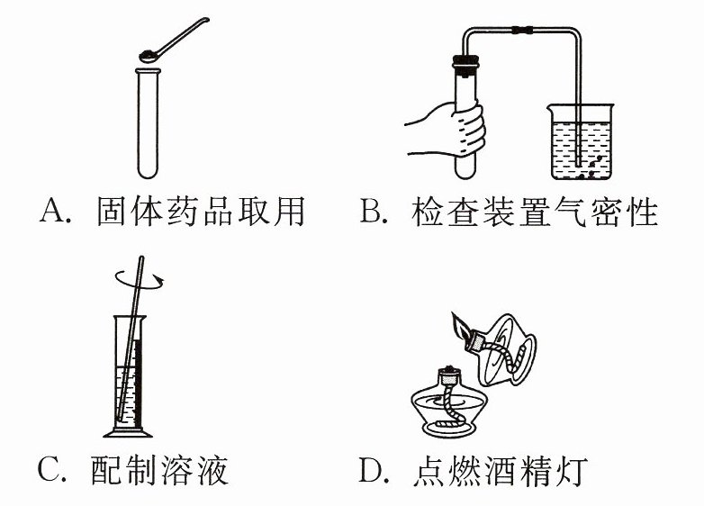 B 提示:往试管里装入固体粉末时,为避免药品沾在管口和管壁上,可先使试管倾斜,把盛有药品的药匙(或用小纸条折叠成的纸槽)小心地送至试管底部,然后使试管直立起来;检查装置的气密性:将导管置于水中,用手紧握试管,观察导管口是否有气泡冒出,有气泡冒出,说明装置气密性良好;不能在量筒中溶解固体,应在烧杯中进行;禁止用燃着的酒精灯去引燃另一只酒精灯,防止发生火灾。