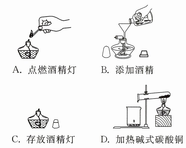 C 提示:酒精易挥发,不用的酒精灯应盖上灯帽;加热碱式碳酸铜固体时,试管口应略向下倾斜,用酒精灯外焰加热固体。