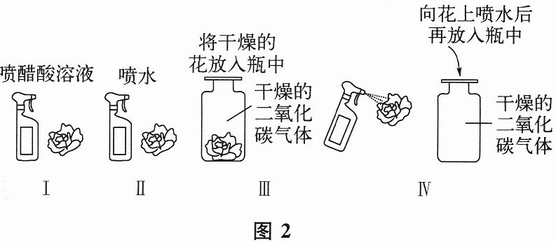 (2) B同学进行了多个对比实验,通过观察小花颜色的变化可以说明:紫色石蕊变红不是水作用的结果,也不是二氧化碳作用的结果,而是酸作用的结果,二氧化碳溶于水一定生成了具有酸性的物质 提示:实验探究二氧化碳能与水发生反应生成具有酸性的物质,既需要证明它能与水反应,又需要证明反应后的产物具有酸。A实验中易产生"二氧化碳能使石蕊溶液变红"的错误结论。B实验中Ⅱ说明水不能使石蕊变红,Ⅲ说明干燥的二氧化碳不能使石蕊变红,Ⅳ说明只有二氧化碳与水相互作用后的产物才能使石蕊变红,与Ⅰ实验对比说明该产物具有酸性。