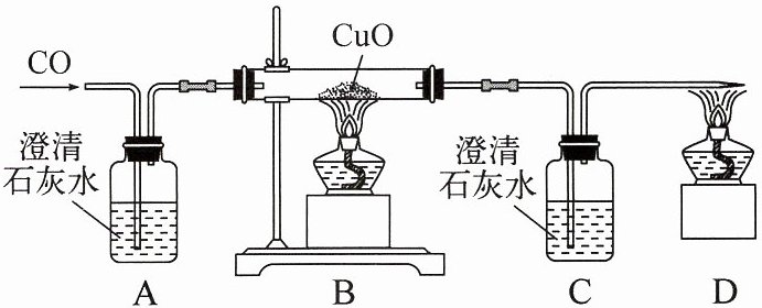 B 提示:二氧化碳能使澄清石灰水变浑浊,澄清石灰水变浑浊,说明有 CO₂生成;一氧化碳与氧化铁在高温下反应生成铁和二氧化碳,该反应中,失去氧的物质是氧化铁,硬质玻璃管中固体质量逐渐减小;一氧化碳有毒,直接排放到空气中会污染环境,常在装置末端的导管口放一盏燃着的酒精灯点燃尾气,利用的是一氧化碳具有可燃性,将有毒的一氧化碳转变成无毒的二氧化碳。