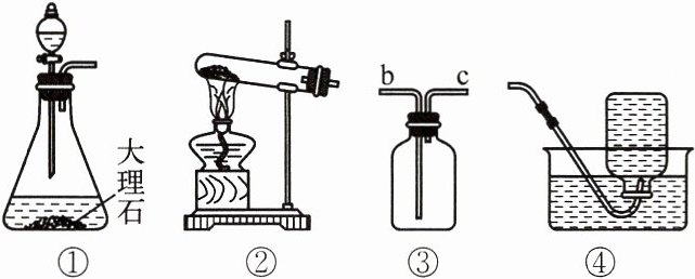 D 提示:用过氧化氢和二氧化锰制取氧气,应选择固液不加热型发生装置①,氧气不易溶于水,可用装置④来收集氧气;大理石的主要成分是碳酸钙,碳酸钙与稀硫酸反应会生成微溶于水的硫酸钙覆盖在大理石的表面,阻止反应的进一步发生;二氧化碳的密度比空气大,用装置③收集${CO2}$,气体应从管口 b 通入;做铁丝燃烧实验,用装置④收集${O2}$时留部分水,可以防止固体熔化物溅落使瓶底炸裂。