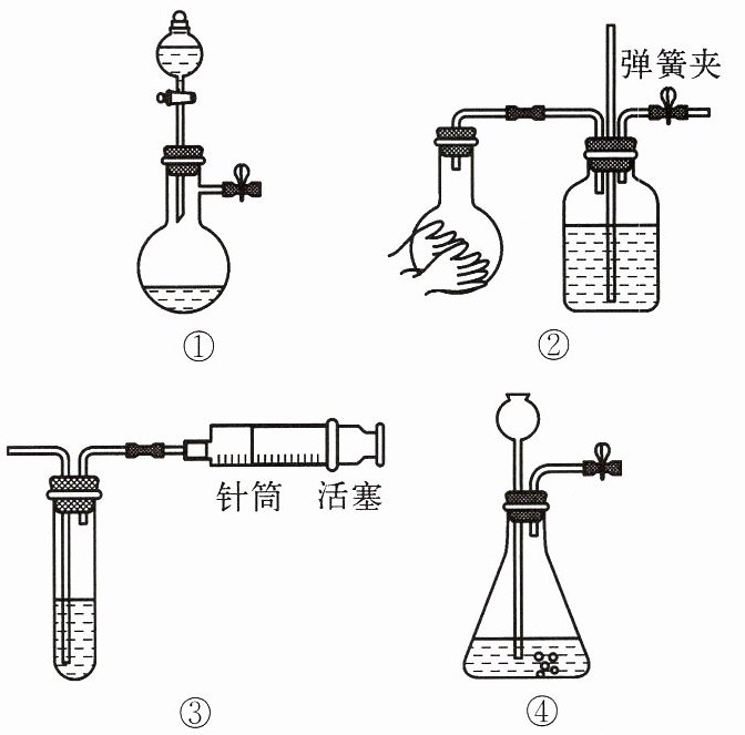 D 提示:图①打开分液漏斗的开关,液体开始会往下滴,但如果装置不漏气,下方密封,慢慢的液体就不流了,如果顺利流下,说明漏气,能检查装置气密性;图②用手掌紧握烧瓶,若气密性良好,玻璃管中上升一段水柱,松手后水柱不下降,若气密性不好,则不会出现此现象,能检查装置气密性;图③向外拉活塞,若气密性良好,则导管口会有气泡产生,若气密性不好则不会有气泡产生,所以能检查装置气密性;图④要证明气密性,打开止水夹,从长颈漏斗口注入水,当液面没过长颈漏斗末端时,关闭止水夹,从长颈漏斗口继续注入水,如果长颈漏斗内液面不再下降,说明气密性良好,所以能检查出装置气密性。