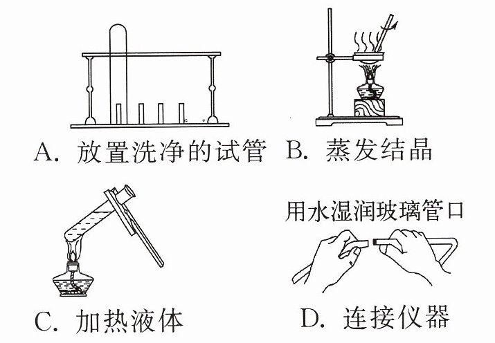 (1)加热后的试管立即用冷水冲洗,容易导致玻璃试管受热不均而炸裂。(2)酒精是易燃物,向燃着的酒精灯里添加酒精容易引发火灾。(3)加热液体时,若试管内液体体积超过容积的$\frac{1}{3}$,液体受热沸腾,容易喷出。(4)将橡胶塞压入放在桌面上的试管时不易控制力度,容易将试管压碎,甚至刺破手掌。