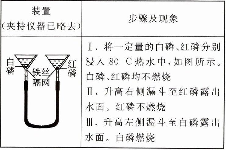 (2)Ⅱ中升高右侧漏斗至红磷露出水面,红磷不燃烧,是因为温度没有达到红磷的着火点;Ⅲ中升高左侧漏斗至白磷露出水面,白磷燃烧,这是因为白磷既与氧气接触,温度也达到了白磷的着火点,对比可知可燃物燃烧的条件是温度达到可燃物的着火点。