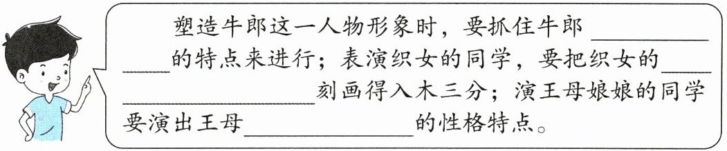 塑造牛郎这一人物形象时,要抓住牛郎 的特点来进行;表演织女的同学,要把织女的 刻画得入木三分;演王母娘娘的同学要演出王母 的性格特点。