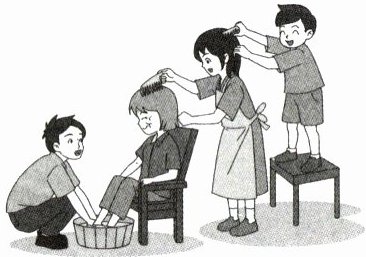 (2)除夕之夜,全家在享受团圆佳节。奶奶忙前忙后,为我们准备好吃的;妈妈在厨房里为奶奶打下手,洗菜、盛饭,忙得不亦乐乎。看到奶奶和妈妈这么辛苦,我赶紧帮忙摆好桌椅板凳,为大家拿好碗筷。