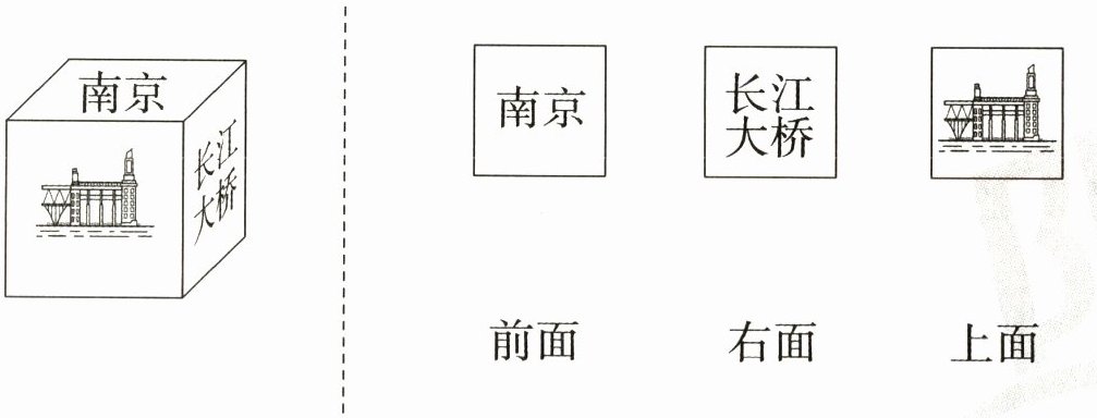 从前面观察该立体图形,能看到“南京”两个字在上方,“长江大桥”的图案在下方,所以从前面看到的形状对应的是标有“南京”和“长江大桥”且“南京”在上、“长江大桥”在下的图形,应与“前面”相连。
