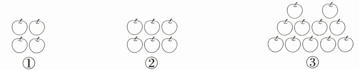 2. 如图,有三堆苹果,要使每堆的个数相等,可以从( )移动( )个到( ),再从( )移动( )个到( ),这样平均每堆有( )个苹果。