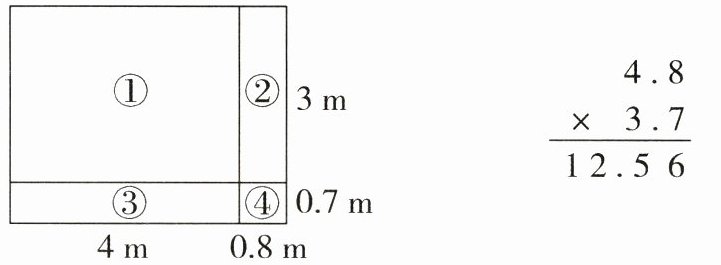 2.优优的房间长4.8米,宽3.7米,她按如图所示的方式列竖式计算房间的面积,从图中可以发现她少算了( )和( )的面积,这间房间的面积是( )平方米。(3分)
